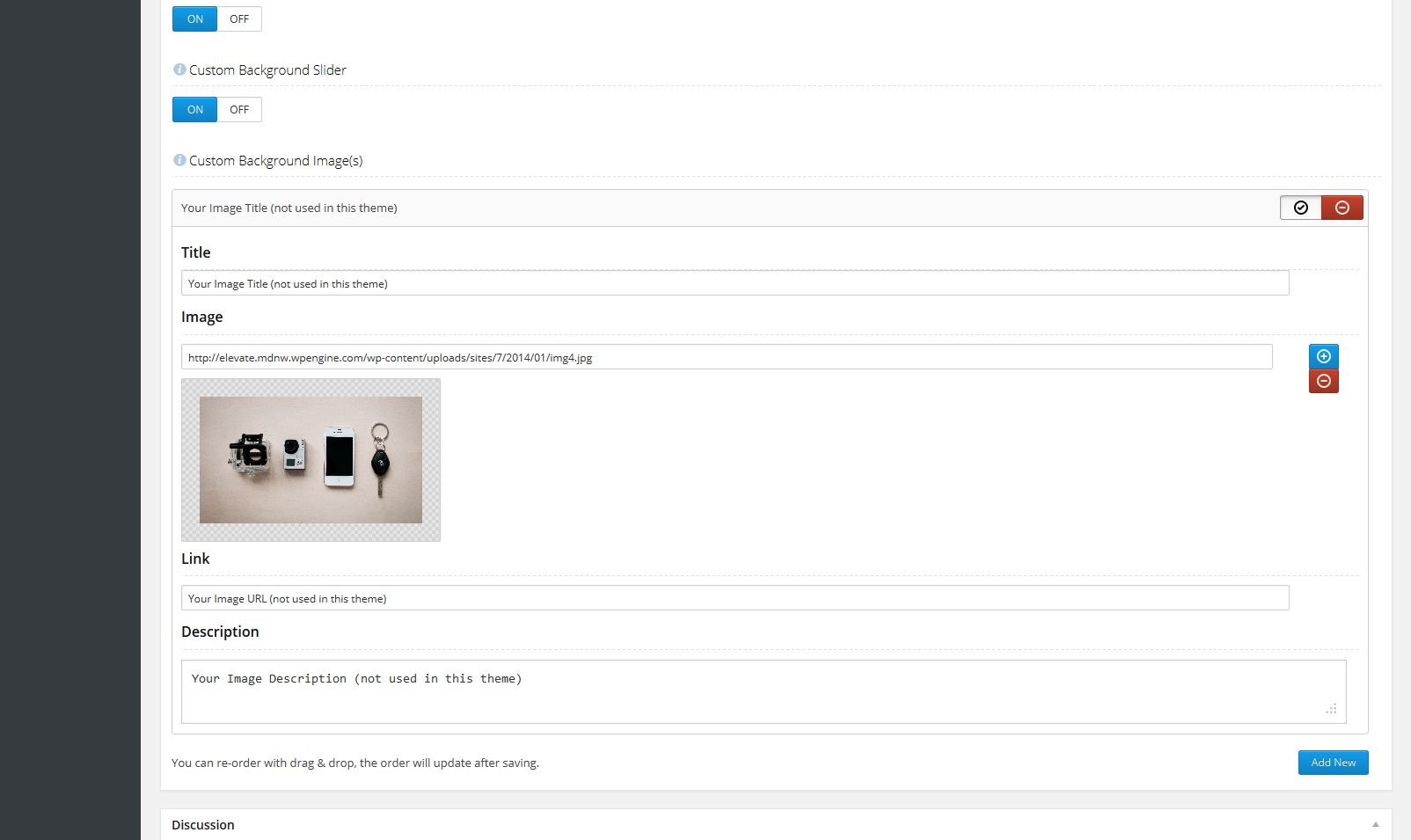 You can assign a background image slider to each page & post on the theme. Simply turn the “Custom Background Slider” toggle on, then upload your images: