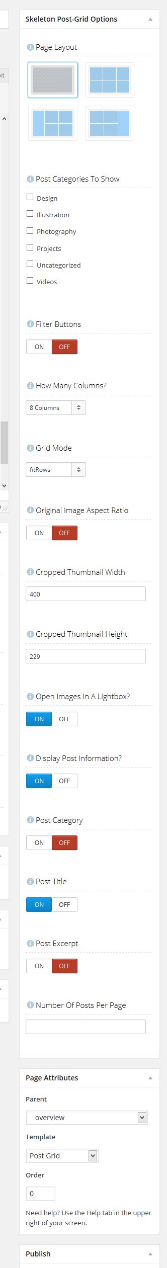 Once you have at least a couple posts setup, create a new page. On that new page, select the “Post Grid” template from the right sidebar panel. A new options panel will show up on that right sidebar – fill out the options (each one has a list of notes attached) to get it setup the way you want. Click the following thumbnail to see the full options for the post-grid.