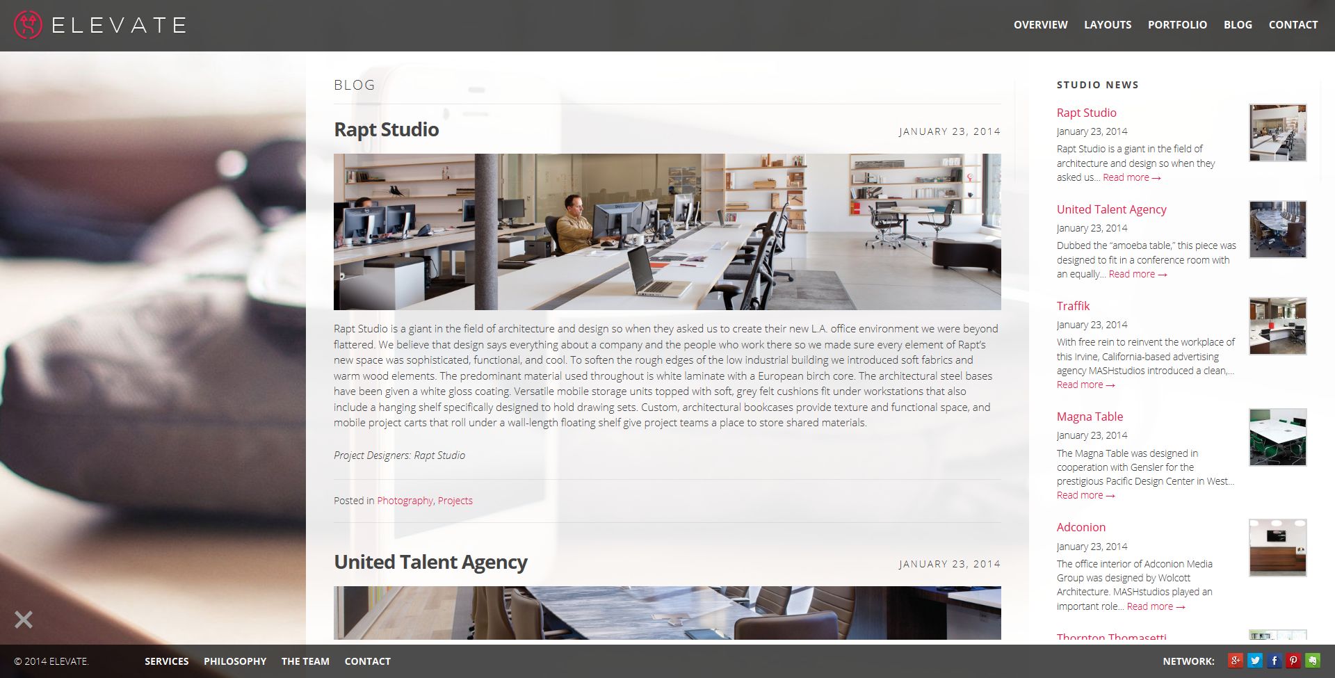 If you have problems with not seeing the Theme Customizer options, make sure that you have successfully installed the “Styles for WordPress” plugin and the “Styles: Elevate Package” that the theme will prompt you to install upon activation.