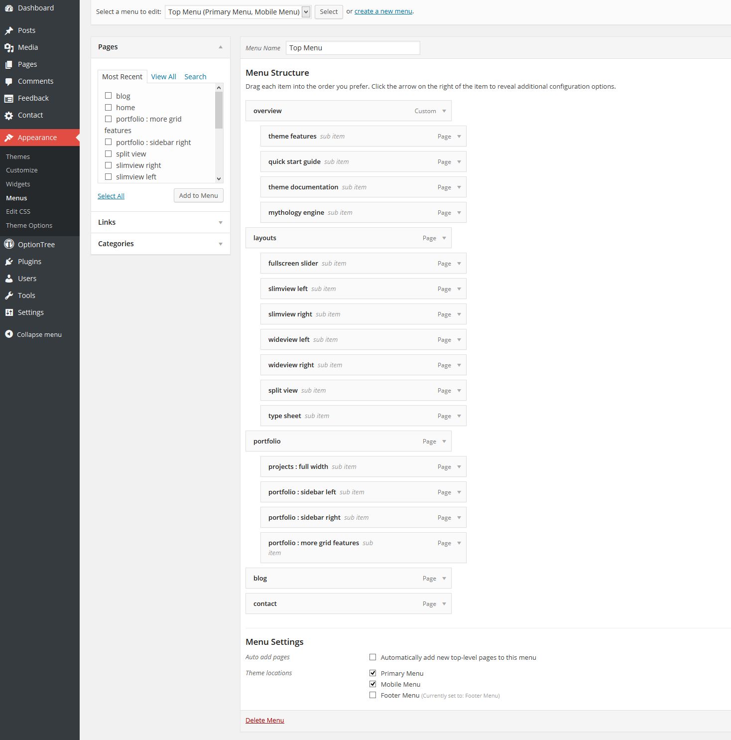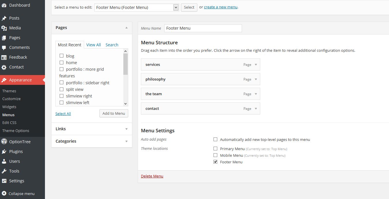 This theme has three primary menu spaces, and you must setup each from the Appearances > Menus panel. Once you’ve added a few pages, this will likely be your next stop in the theme-setup process. Just visit the Menus manager, create a new menu for each space (you’ll likely want at least 2 or 3), and assign them to the space you want them to show up at. Reference the following two images to see how our demo is setup: