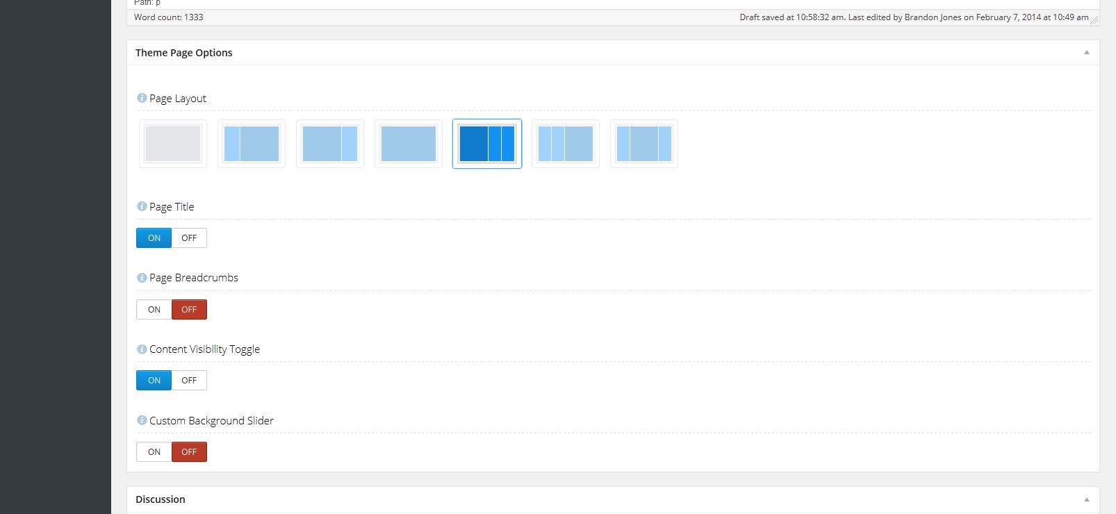 In addition to the Theme Options panel, this theme also integrates a handful of Page & Post options. These panels will show up on any Page or Post editor, underneath the basic content editor. In the event that they do not appear, make sure that you have enabled them from the top-right “Screen Options” panel. These panels will allow you to override theme-level options on individual pages and posts.