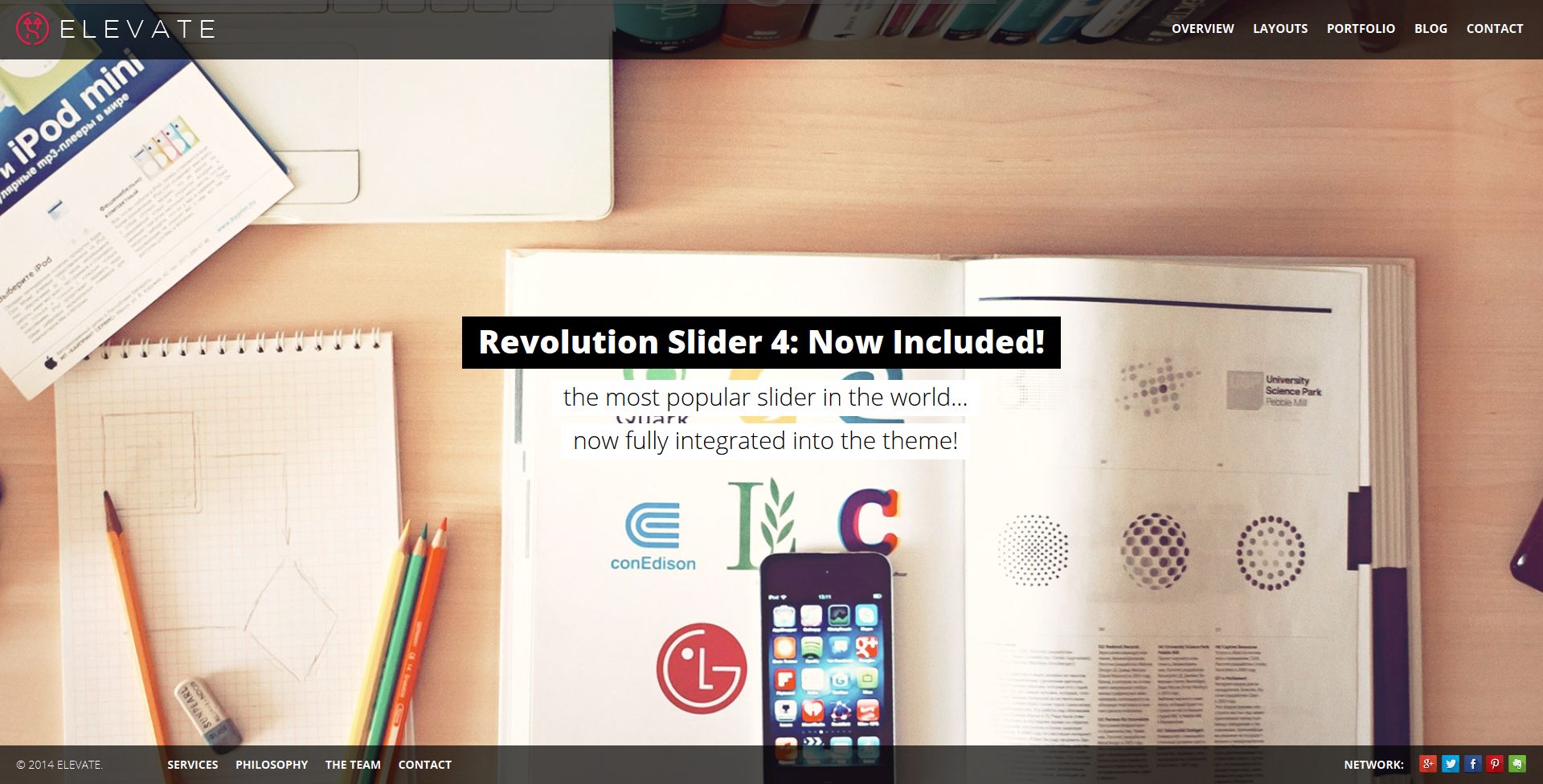 As of version 1.1, Elevate now supports the Revolution Slider plugin as an alternative to the default theme background slider. Using it is pretty easy, here’s the short version: