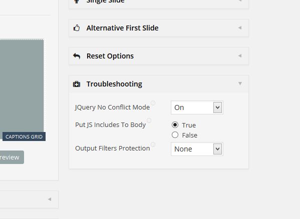 Note that we’re forcing the “full-width” option, and the slider is “fullscreen”. Those are the most important options. We also recommend that you open the “Troubleshooting” tab in the right sidebar of that same panel and click the option to include JS in the body of the page (this isn’t required for everyone, but it’s generally a good idea just to be safe):